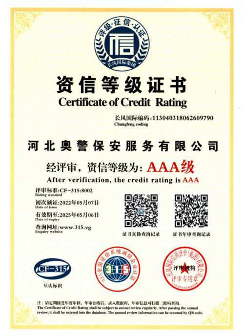 河北奧警保安服務(wù)有限公司河北奧警保安服務(wù)有限公司成立于2017年7月20日,注冊(cè)資金1000萬元,具有中華人民共和國《保安服務(wù)許可證》(編號(hào):冀公保服20180085)的綜合性安保企業(yè)。